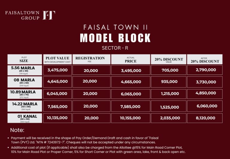 The Faisal Town Phase 2 R Block payment plan is straightforward and buyer-friendly. All plots are offered on a full-payment basis, eliminating lengthy installment schedules.